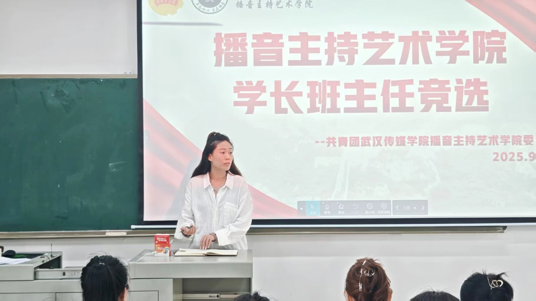 为保障2025级新生工作有序开展,帮助新生尽快适应并融入大学生活,2025年9月15日,武汉传媒学院播音主持艺术学院在3304教室开展2025级学长班主任竞选。播音主持艺术学院团委书记李思思,辅导员王巧、童雅棋、易巧玲、郭子兰、戚宇凡及学生会执行主席刘书伊担任本次竞选评委。