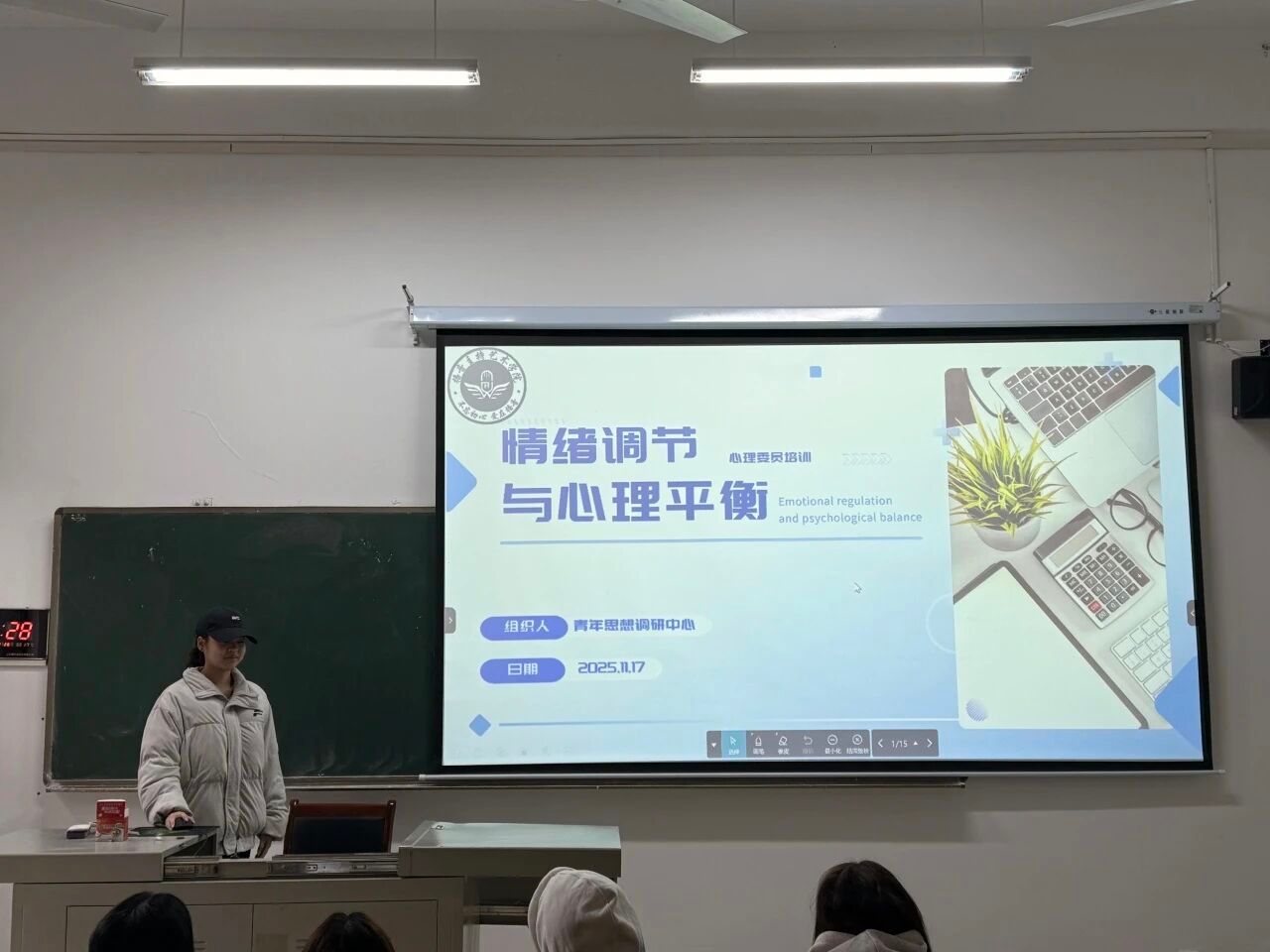 会议伊始,青年思想调研中心负责人罗洋发言,在发言中围绕“情绪调节与心理平衡”对心理委员展开培训。首先介绍情绪调节的重要性、理论基础与心理平衡的核心概念;然后讲解了情绪认知评估、放松训练等调节策略;接着从自我评估、日常习惯、专业求助等方面阐述心理平衡的维护方法;最后展望了心理平衡预防性维护的前景及跨文化、社会化的应用方向,为心理委员提供了从理论到实操的心理支持工具。