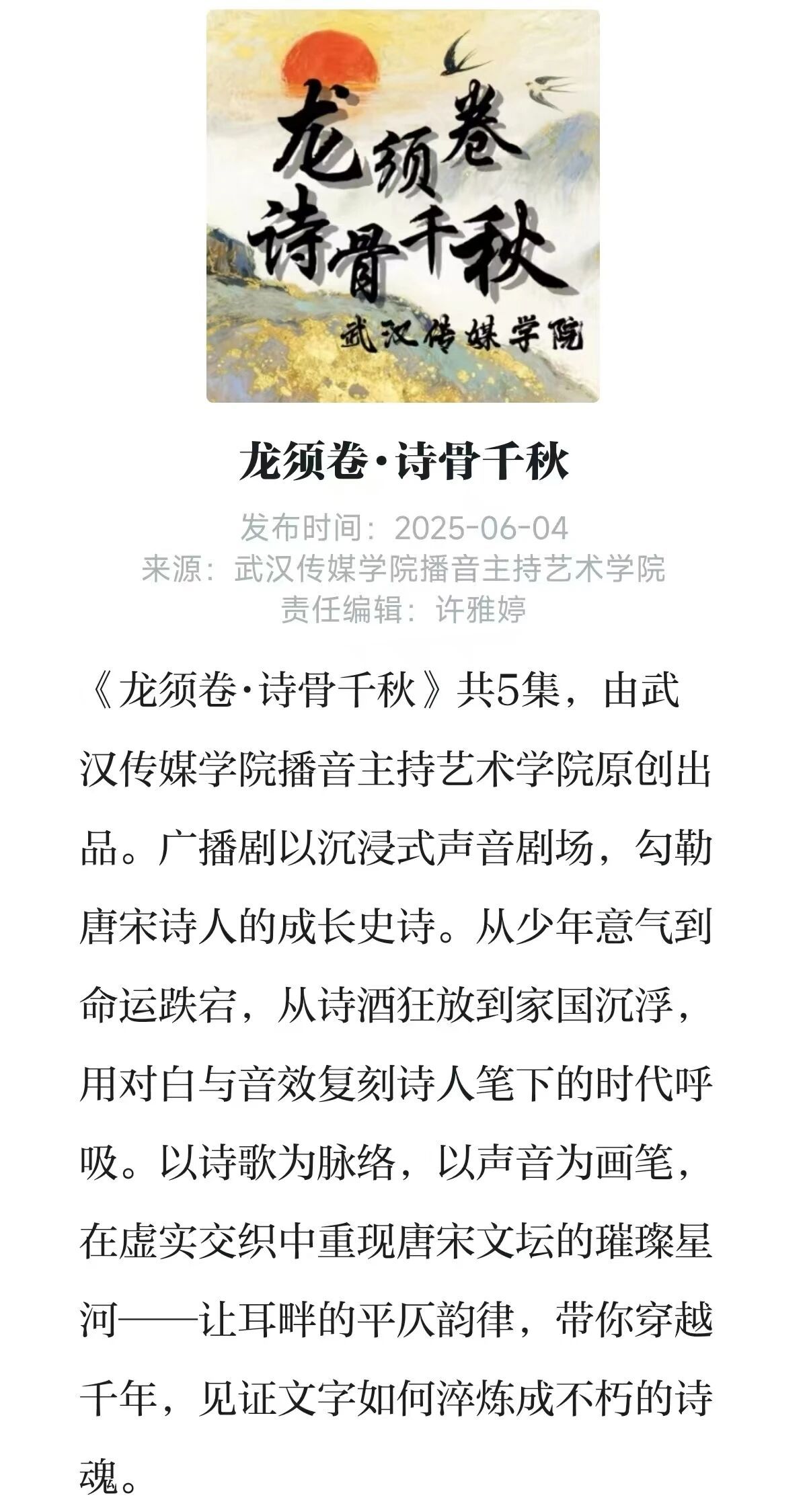 (通讯员:许维胜)近日,武汉传媒学院播音主持艺术学院师生依托省级一流课程《影视配音创作》深度参与创作的广播剧《“焊” 卫长空》,与学院原创广播剧《龙须卷》一同在 “学习强国” 平台获推荐展播。其中,《“焊” 卫长空》以 “大国工匠” 孙红梅为原型,讲述她二十年如一日攻克航空发动机焊接技术的事迹;《龙须卷》则以沉浸式声音剧场再现唐宋诗人的精神史诗。