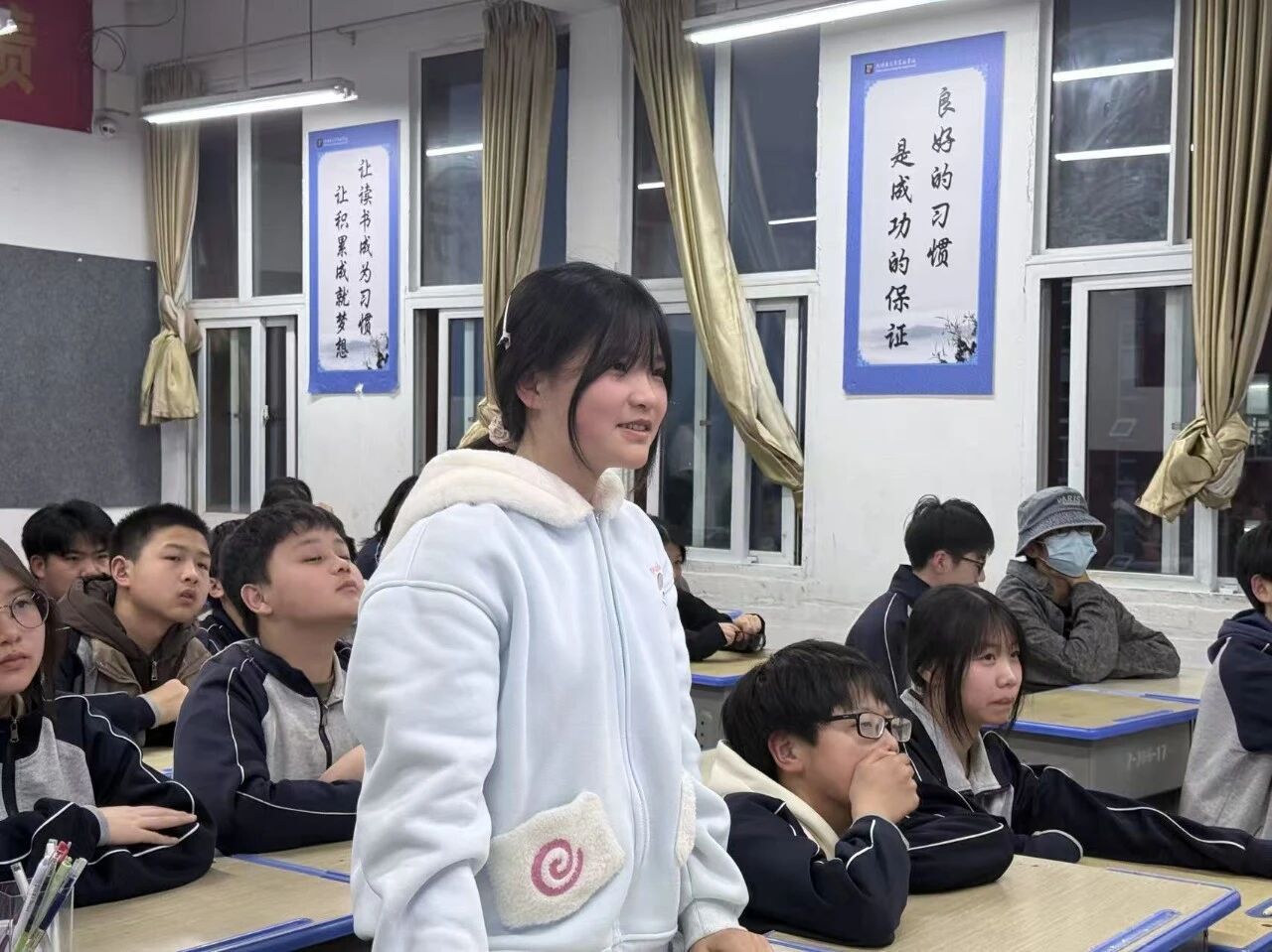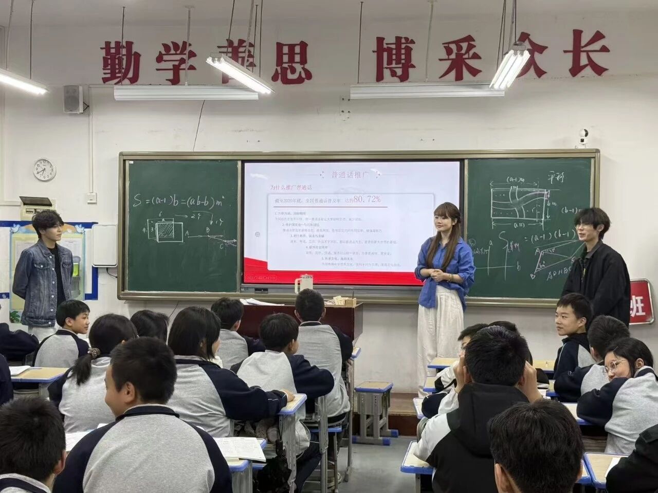 在普通话推广环节,同学们化身语言小老师,将专业知识转化为通俗易懂的趣味课堂。他们从普通话的概念和发音规范讲起,结合绕口令、诗词朗诵,带领同学们在轻松的氛围中感受语言的魅力。现场气氛热烈,孩子们踊跃举手,在一问一答、跟读比拼中大胆开口练习,欢笑声和掌声回荡在教室中。