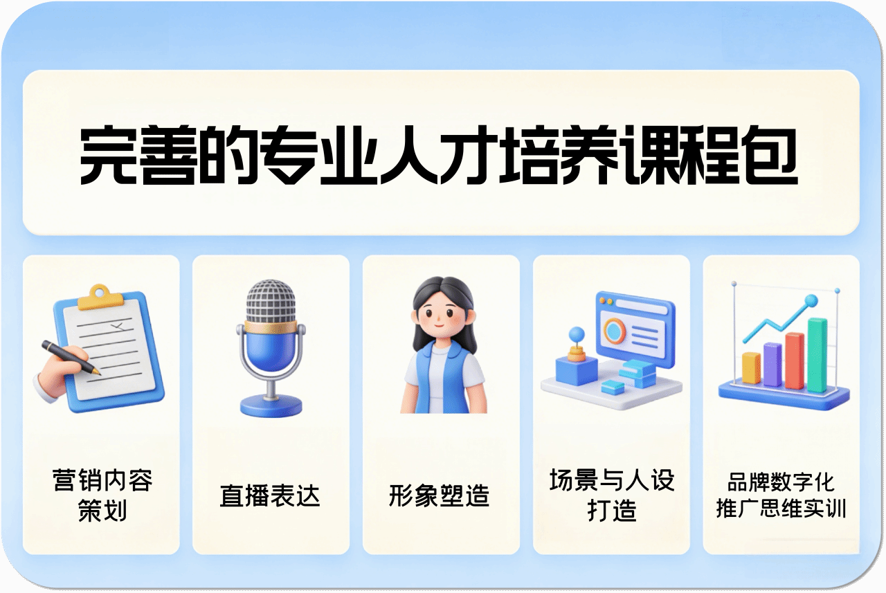 课程体系对标直播电商、品牌营销等发展方向,不仅涵盖营销内容策划、直播表达、形象塑造、场景与人设打造等实用技能,还引入品牌数字化推广思维实训,搭建起完善的专业人才培养课程包。