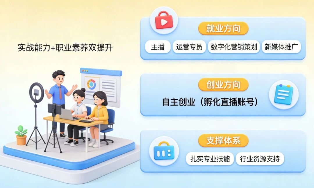 以市场需求为导向,注重培养学生的实战能力与职业素养,毕业生可在直播电商平台担任主播、运营专员,在品牌企业从事数字化营销策划、新媒体推广等岗位,也可依托所学知识自主创业孵化直播账号,凭借扎实的专业技能与行业资源支持,为个人职业发展开辟多元化路径。