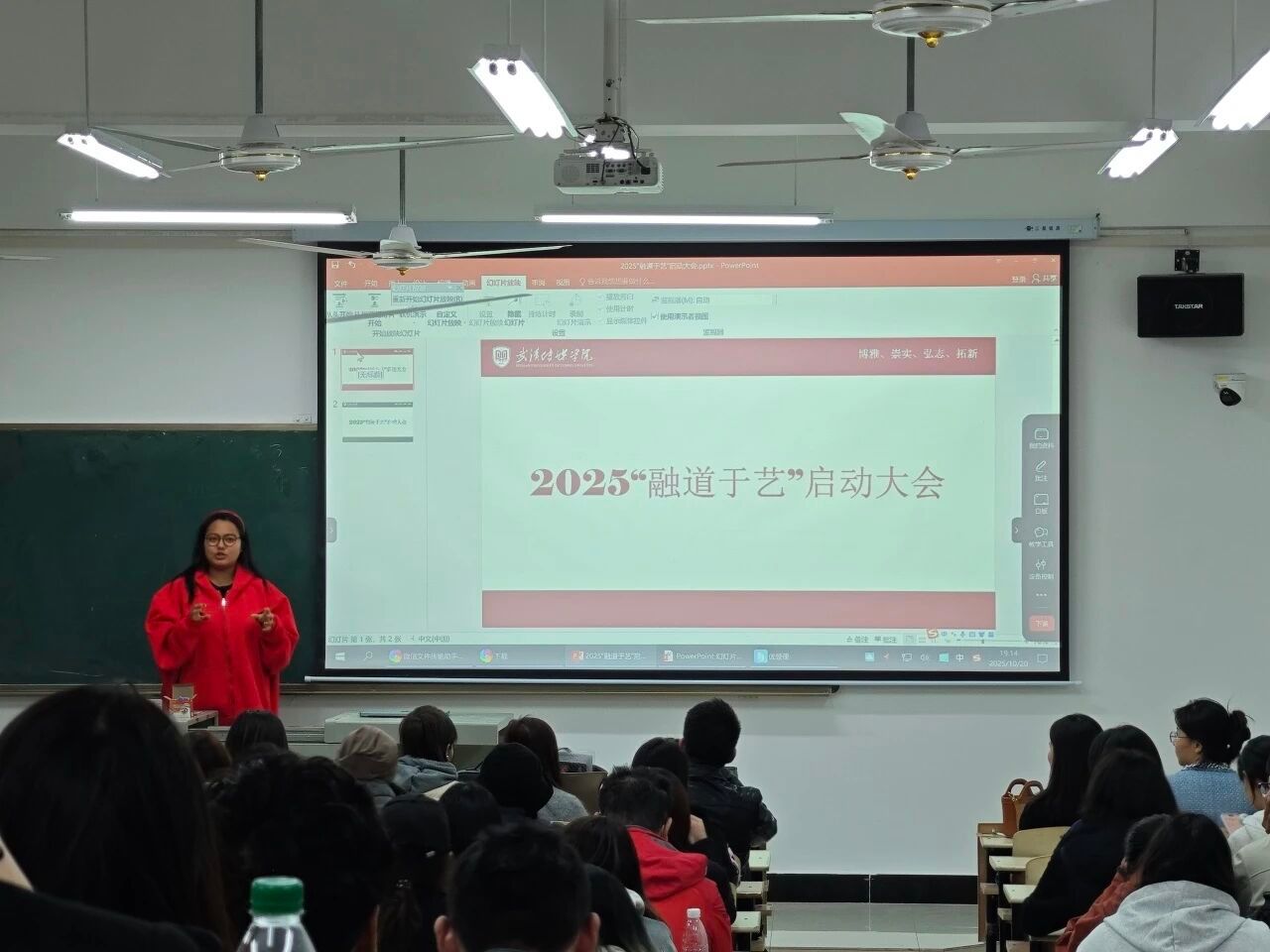 为进一步促进中华优秀传统文化与艺术教育的深度融合,搭建传统文化传承创新与艺术实践相融合的优质平台,2025年10月20日,武汉传媒学院播音主持艺术学院于3304教室举行2025“融道于艺”启动大会。播音主持艺术学院学生科科长费燕琴老师,播音主持艺术学院专业带头人薛丹老师,播音主持基础教研室主任胡桐老师,副主任梁海新老师,专业教师、王皓翔老师、蒋奕清老师、庹露丹老师、马嘉琪老师、黄约拿单老师、杨帆老师、李一鸣老师,播音主持系副主任白墨老师,专业教师唐诗权老师、马嘉欣老师,口语传播系刘然老师、翟一鸣老师,双语播音系钱萱尔老师、钱婉依老师出席本次大会。