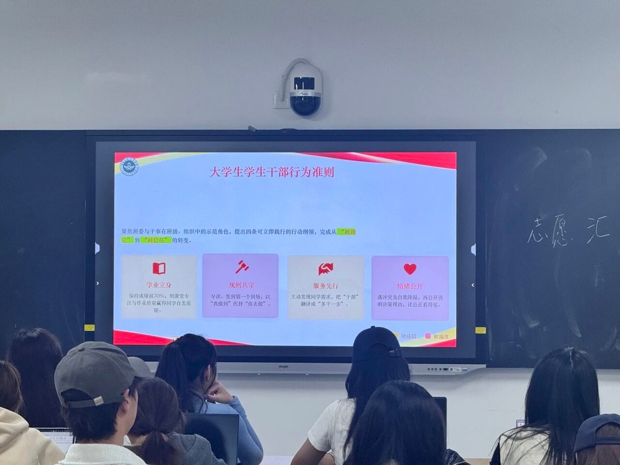 随后,学习部部长武一帆讲解了“到梦空间”“志愿汇”软件的使用方法,同时强调了其对于班级工作开展的重要意义。同时,武一帆着重阐述了签字表填写以及材料提交的具体要求,明确了学生干部的职责与协作规范。他表示,学生干部应严格自律,持续提升综合能力,为班级和学院的发展贡献力量。